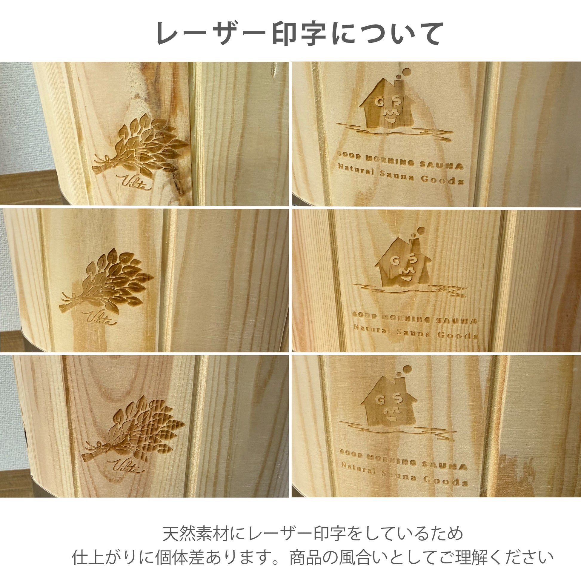 フィンランド式サウナのロウリュに最適なデザインで、アロマ水を熱した石に注ぐことで、香り高い蒸気を生み出します。「GOOD MORNING SAUNA」のロゴと「Vihta-ヴィヒタ」のロゴが焼き印されており、サウナルームに高級感をプラスします。